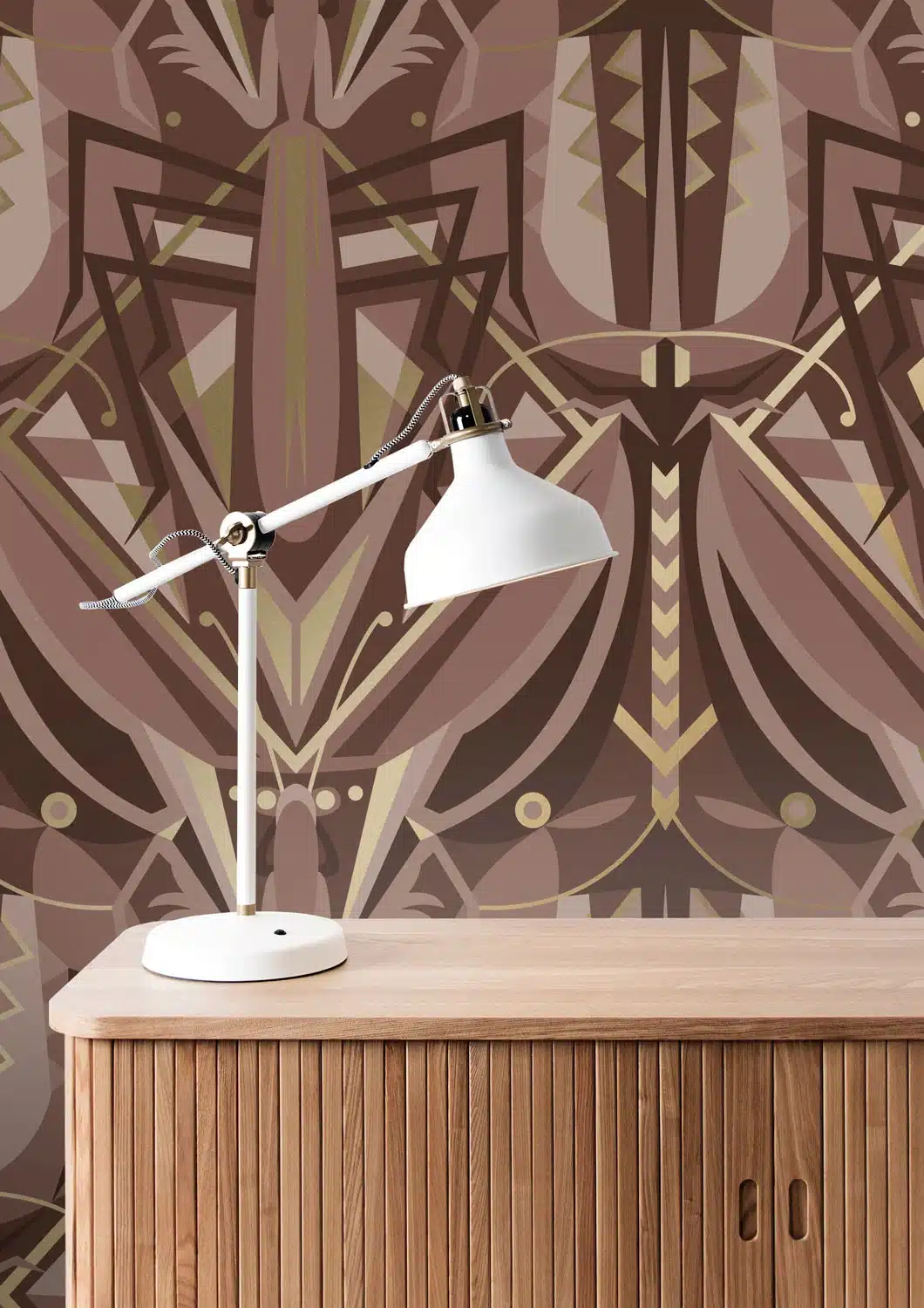 Dit goud behang is geïnspireerd op de bekende art déco stijl uit de jaren ‘30. Als je goed kijkt, zie je dat de stijlvolle grafische patronen onder meer zijn opgebouwd uit sprinkhanen. Verkrijgbaar in drie kleuren.