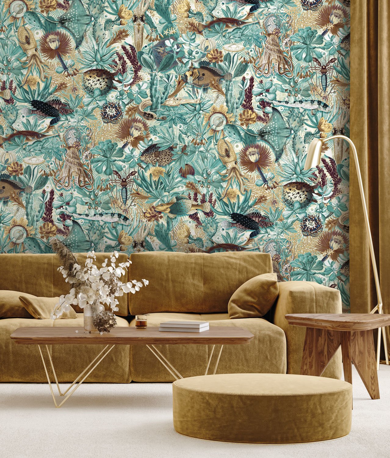 Dit behang is speciaal ontworpen voor mensen met interieurlef. De meest prachtige vissen en andere exotische waterdieren stelen hier de show. Door een uitgekiende mix van illustraties en bijzonder kleurgebruik ontstaat een levendige behangwand.