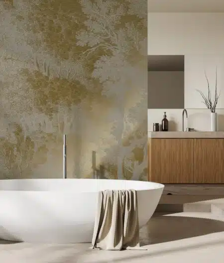 Dit goud behang is gebaseerd op oude gravures van landschappen. Deze tekening zorgt voor diepte, waardoor je kamer ruimer oogt. Met een vleugje goud op de muur krijgt je interieur bovendien meer allure.