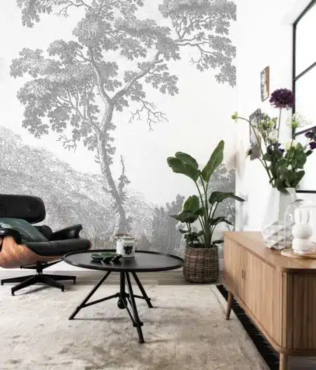 Dit behang met pentekeningen van landschappen past goed in een Scandinavisch interieur. De achtergrondkleur is gebroken wit (vergelijkbaar met RAL 9010) en daardoor goed te combineren met andere kleuren. Verkrijgbaar in 4 verschillende afbeeldingen.