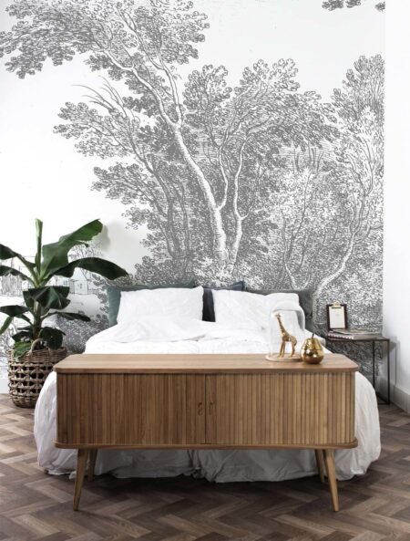Dit behang met pentekeningen van landschappen past goed in een Scandinavisch interieur. De achtergrondkleur is gebroken wit (vergelijkbaar met RAL 9010) en daardoor goed te combineren met andere kleuren. Verkrijgbaar in 4 verschillende afbeeldingen.