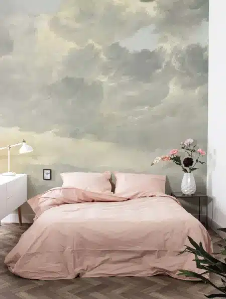 Net echt, deze geschilderde wolkenlucht. Het behang is zo gedetailleerd, je ziet zelfs de kleine barstjes in het schildersdoek. Rustgevend voor in de slaapkamer, met een mooi opgemaakt bed ervoor met veel kussens. Een absolute blikvanger.