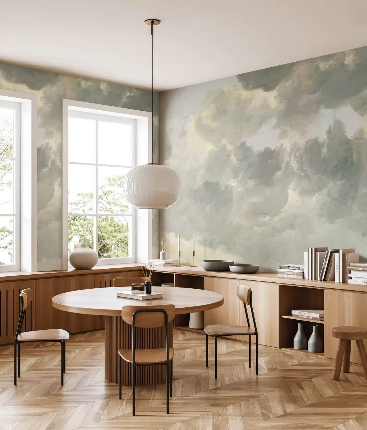 Net echt, deze geschilderde wolkenlucht. Het behang is zo gedetailleerd, je ziet zelfs de kleine barstjes in het schildersdoek. Rustgevend voor in de slaapkamer, met een mooi opgemaakt bed ervoor met veel kussens. Een absolute blikvanger.