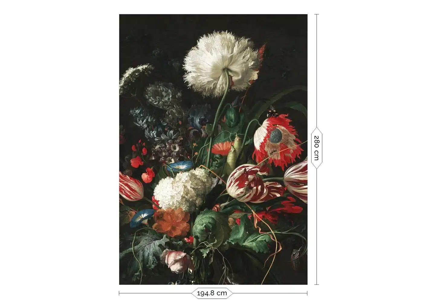 Dit bloemen behang is een uitsnede uit een beroemd schilderij van Jan Davidsz de Heem (1670). Het origineel hangt in het Rijksmuseum in Amsterdam. Bijna 350 jaar na dato kun jij dit kleurrijke bloemenbehang bij jou op de muur plakken.